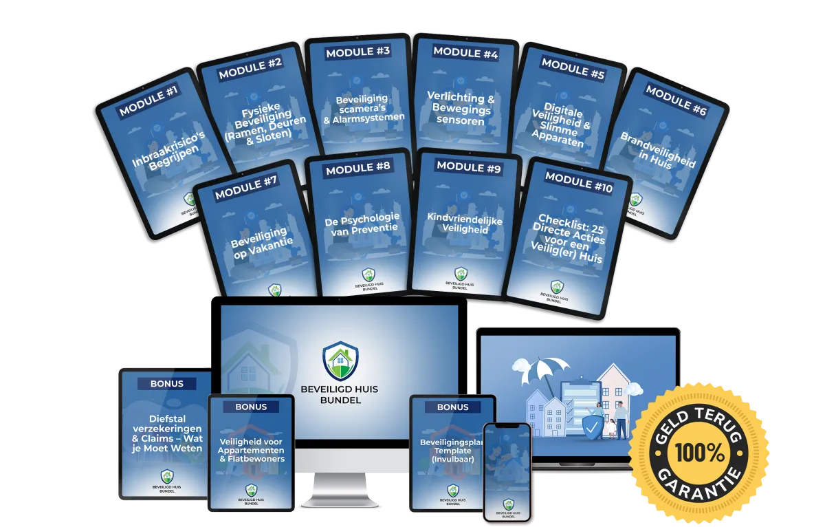 Je krijgt ALLE tools, inzichten en slimme trucs om je huis te beveiligen — van ramen en sloten tot camera’s, slimme apparaten, brandveiligheid en meer. Inclusief een invulbaar beveiligingsplan waarmee je alles concreet maakt.